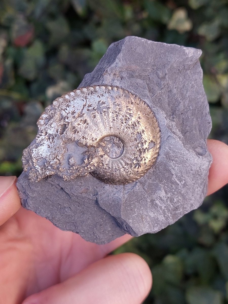 Cette ammonite a été naturellement recouverte de pyrite lors de sa fossilisation, ce qui lui donne un coté mystérieux. Cette beauté mérite une place de choix dans une vitrine de fossiles.